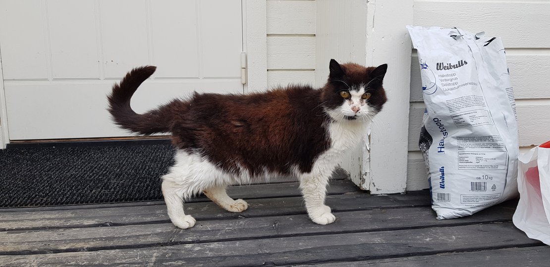 Kom mjauende utenfor huset vårt. Ustelt i pels og ser ut som verkende øyne. Avføring i pelsen bak. Lukter litt av den. God lyd når den mjauer. Ville inn i huset, men det fikk den ikke, da vi har egen katt..