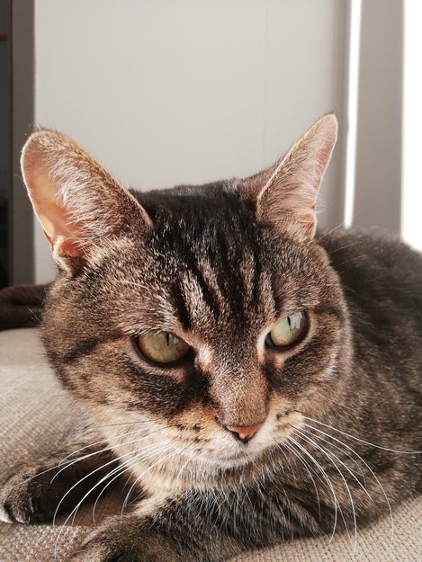 Katten er ca 5 år gammel, liten bygning. Tykk. Potene er korte. Hun hadde på seg et grønt halsbånd med et telefonnummer. Ikke sint eller aggressiv, bare kan være veldig redd.