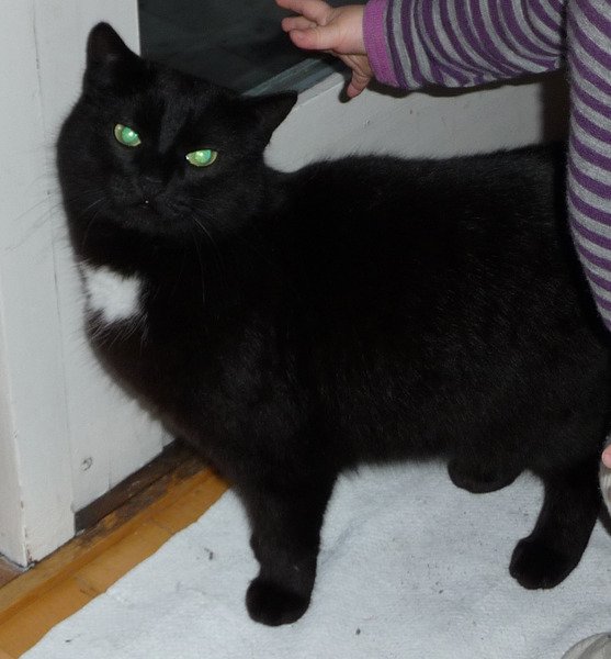 Rolig, reservert med tillitsfull. Kan være litt skvetten for lyder og brå bevegelser. Slank. Helt sort men med hvit flekk på brystet. Grønne øyne.