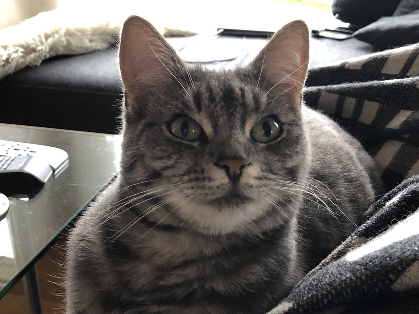 Liten, hunnkatt. Ca. tre kilo. To år gammel. Litt reservert.