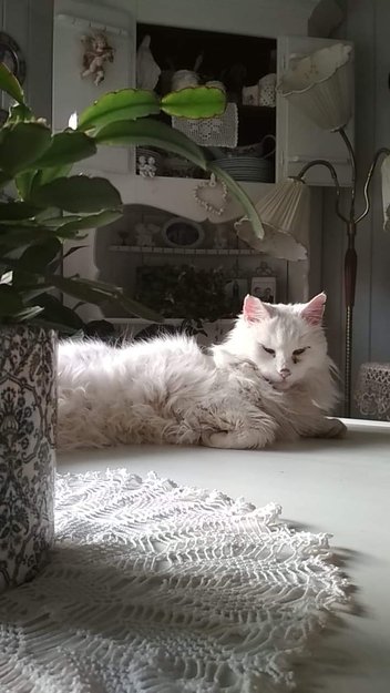 Trulte er en gammel katt, helt hvit, med en liten grå flekk i rompa, lang pels som er litt lurvete da hun er blitt klippet pga knuter i pelsen. Hun har et hakk i den ene øreflippen og mangler tuppen på øreflippen på den andre siden.