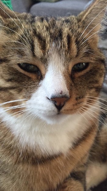 Katten har på seg et grått flåtthalsbånd. Han var veldig sky og sær på gammel adresse, men har vært sosial og kosete i nytt hus, så begge deler kan passe ham.