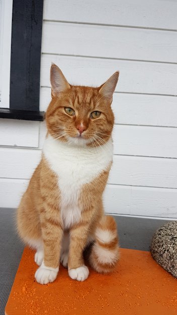 Spenstig, slank katt med lang, stripete hale. Lite, hvitt bliss på snuten. Hvit på bryst og mage og hvite poter, ellers rødstripet. Kastrert, chippet og har tatovering i øret som skal være lett synlig. 2,5 år gammel.