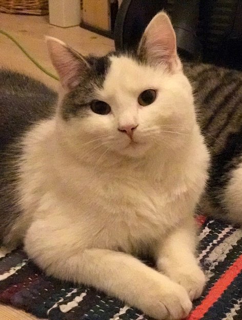 Han er veldig snill og rolig. Liker å sove mye. Han er helt vit på magen og grå på rygg og hale. Han har vitt ansikt, men er grå kring høyer øre.