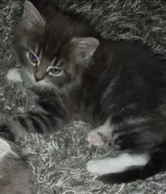 12 uker gammel hannkatt. Mørk stripete/ tigret. Hvit rundt øyner og hvite poter.
