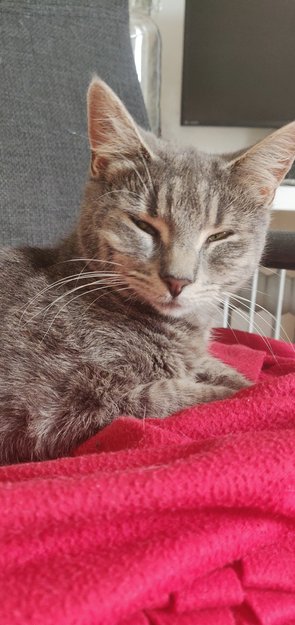 Grå striper m/ gul-grønne øyne, 6 måneder gammel. Kort pels og liten hale.