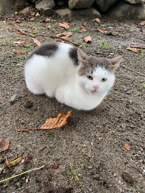 Hvit med grått. Ser ung ut. Tror det er en jente. Tam katt