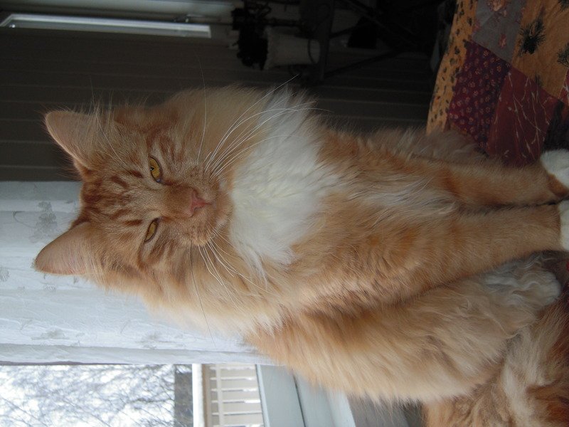 Han har hvitt flek på brysten og hvite poter. Ellers er han oransj, ornasje øyer, og er langhåret.