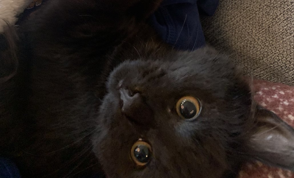 Liten svart hannkatt med halvlang pels. Tykkere hale.