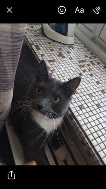 Grå med hvit bryst,hvit stripe på magen og hvite poter, grønne øyne. Pus er ganske skvetten , 6 år gammel.