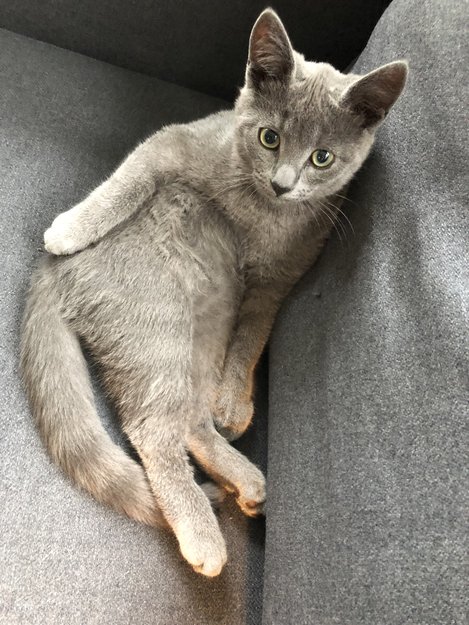 Lysegrå i pelsen, fem mnd gammel, så ikke så stor, veldig leken og kjælen. Svake striper på halen. Vi mener hun lyder navnet sitt (i hvert fall hvis man roper det med veldig lys kosestemme). Veldig savnet her hjemme. Elsker kos og har sannsynligvis mistet mammaen sin altfor tidlig for koser som en kattunge som får melk.