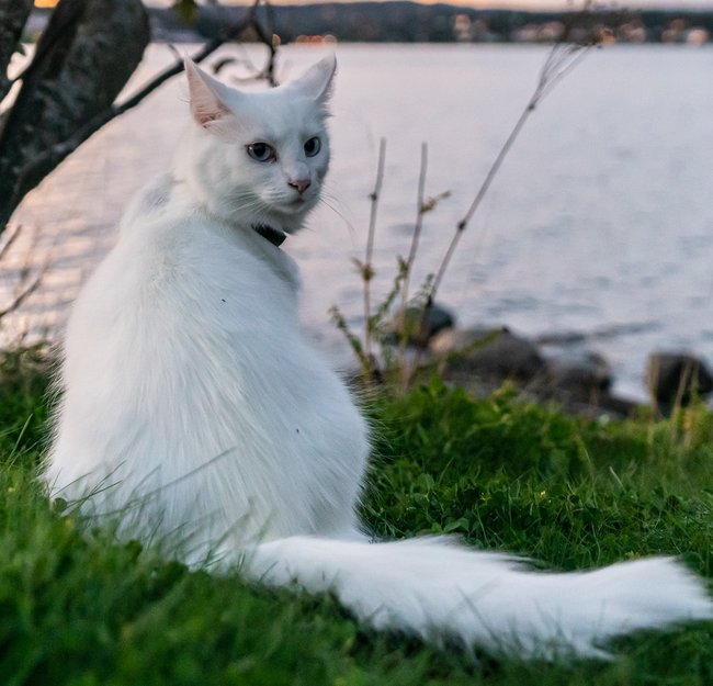 Hun er en norsk skogkatt med helt hvit pels og blå øyne. Hun bærer et grønt anti-flått halsbånd.
