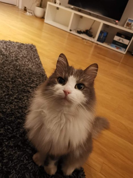 9 år gammel hannkatt, grå og hvit med ekstra klør på potene foran. Kastrert og chippet. Han har en gammel skade på høyre øye. Tjukken er veldig kosete og kontaktsøkende og pleier å komme hjem etter noen timer.