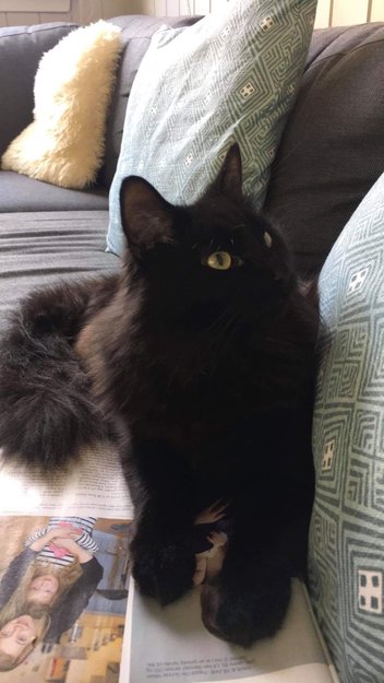 Langhåret, brunsort hannkatt med gule øyne. Har på seg et grått flåtthalsbånd