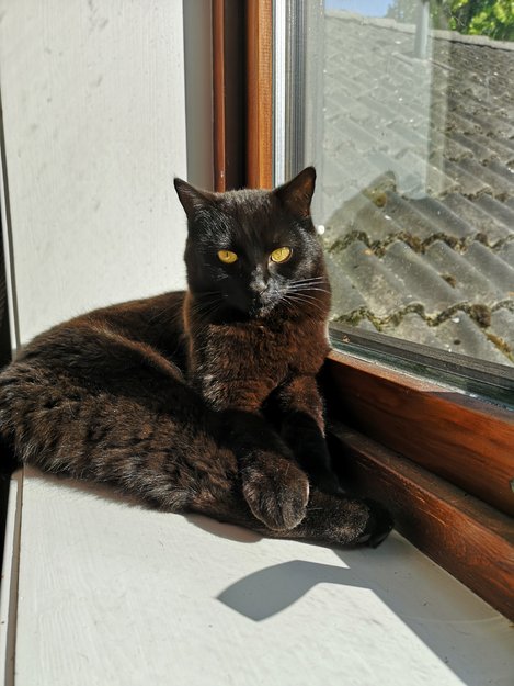 Helsvart hannkatt med gul/oransje øyne. Kort men fyldig pels.