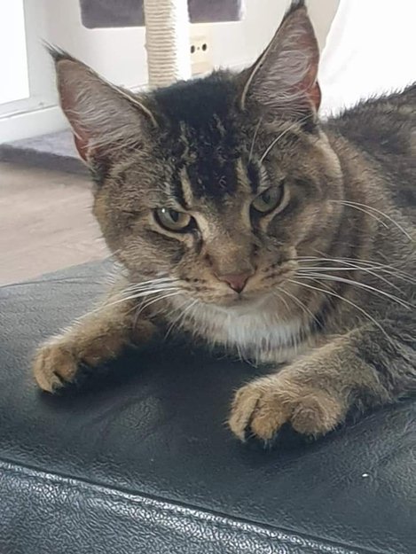 Han er 1 år litt stor for alderen da han er maine coon blanding. Chippet og kastrert.