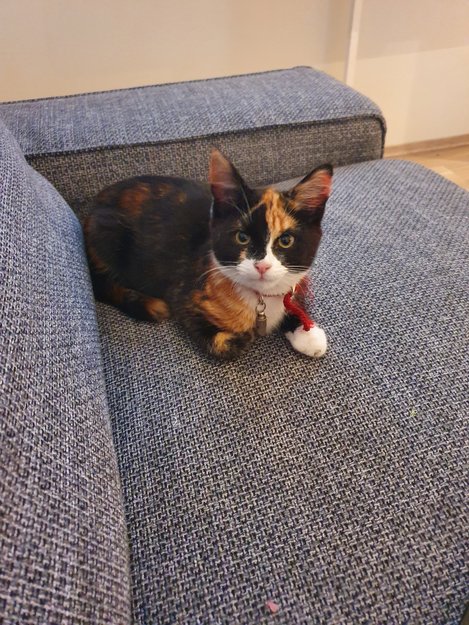 3 farget jentepus,hvit under halsen og mage.Har rødt halsbånd.
