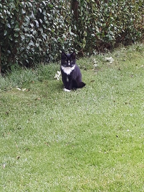 Liten kattunge som Sover hos oss på terrassen. Den er noe sky men veldig nysgjerrig.