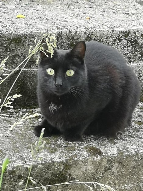 Nesten helsvart, hvit flekk på brystet, liten av vekst og meget sky. Er sikkert veldig skremt, sulten og sliten nok til at han kan lokkes. Er chippet, kastrert og øretatovert.