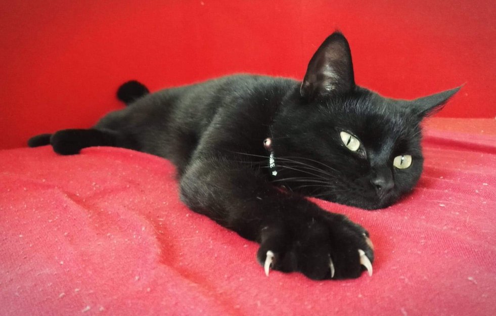 Hun er helt svart. Rød halsbånd. Er veldig kosete og kontakt søkende. Hun er ID chippet og har øre merke og er sterilisert.