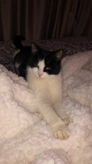 Svart på ryggen og halen, og hvit på magen og beina/labbene. Er hvit mellom øynene og rundt munnen, ellers svart i ansiktet. Har et svart merke under hver pote.