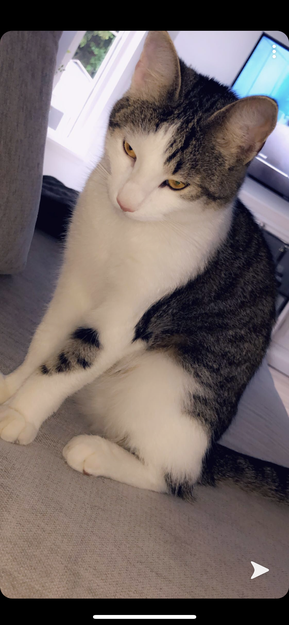 Har et lite rund stripete mønster på poten. Liten katt.