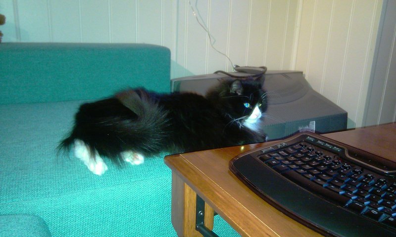 Svart langhåret katt m/ hvit maske, bryst og poter.