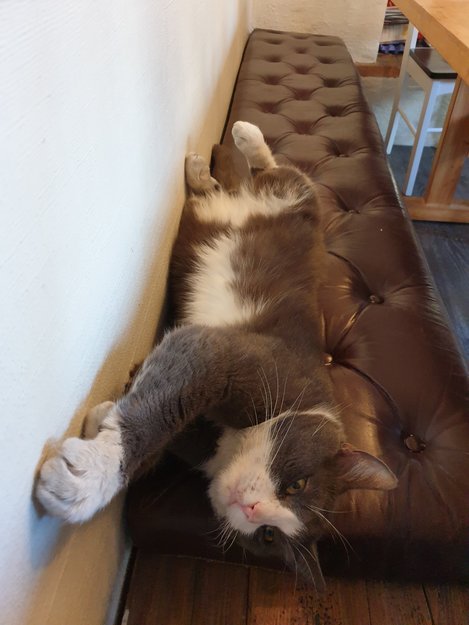 Mio er grå, med litt hvitt i ansiktet og hvitt mage....