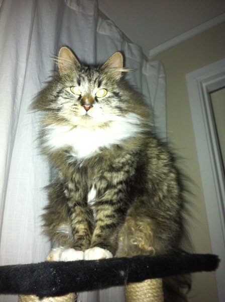 Liten i størrelse. lang bustete pels. Grønnlige øyne. litt engstelig, nervøs, men veldig kosete når han er trygg.