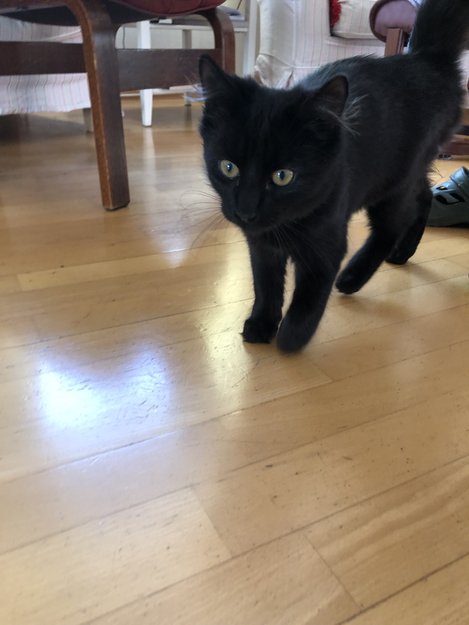 Helt svart. Ca 5/6mnd gammel. Hannkatt.