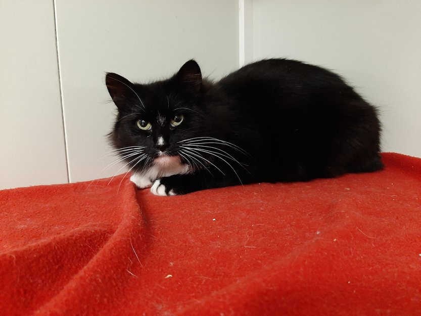 Svart og hvit. Lengre hvite sokker på bakbeina, små hvite sokker på frambeina. Ikke chippet eller kastrert.