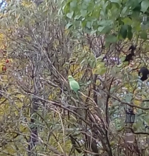 Fuglen har holdt til i nærområdet siden sommeren. Det er antagelig en indisk halsbåndparakitt. Den er av farge grønn uten store sjatteringer, og litt rødt om nebbet.