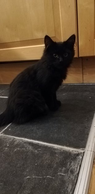 Kjennetegn; Den er helsvart og langhåret, svarte værhår og gulgrønne øyne. Tam, elsker kos og er leken, så den har nok et kjærlig hjem en plass.