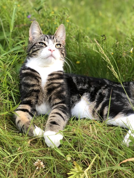 Han er sjeldent ut lenge av gangen og holder seg rundt tomta. Han kommer alltid når vi roper. En veldig bedagelig katt som aller helst ligger inne og sover.