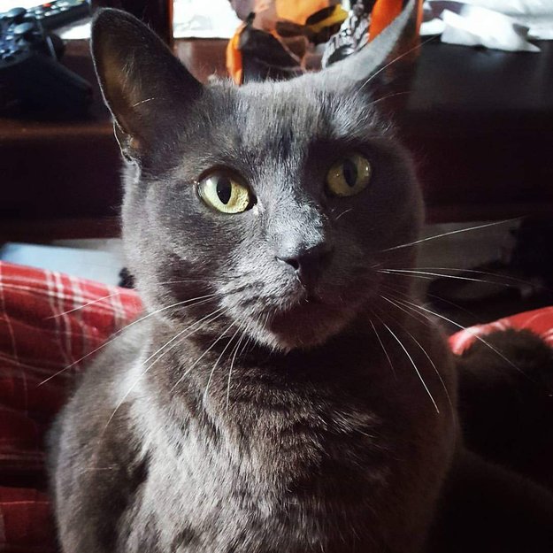 Lucy er korthåret og helt grå. Hun er ganske liten, smalt ansikt og grønne øyne, men litt rund mage.