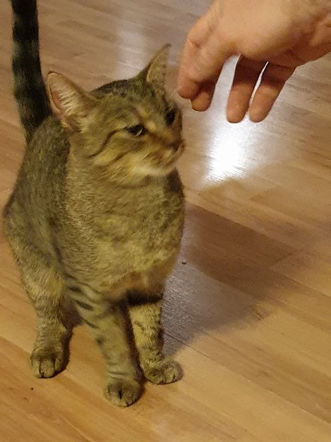 Katten kom i hagen vår på kvelden og vi tok den inn for å varme seg og gå den mat. Den var veldig sulten. Neste morgen mjauet den utenfor døren. Den kom inn og fikk mat og vann. Katten går rundt på Åsbråten.