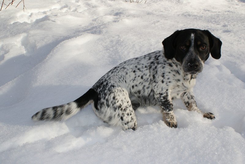 Hvit med sorte prikker, sort hode, sort flekk på halerota. Korte bein. 13 kg.