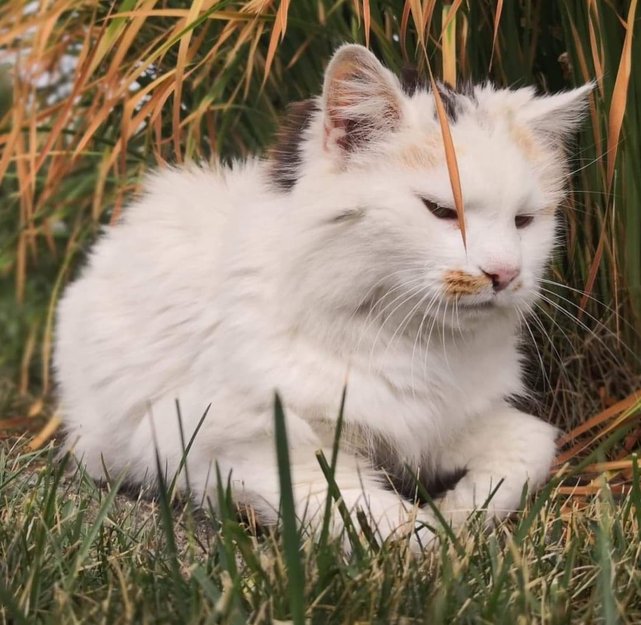 Hvit katt med lang og tett pels. Slank, 19 år. Sosial. Den har sorte og brune flekker som går fra hodet og ned på halen.