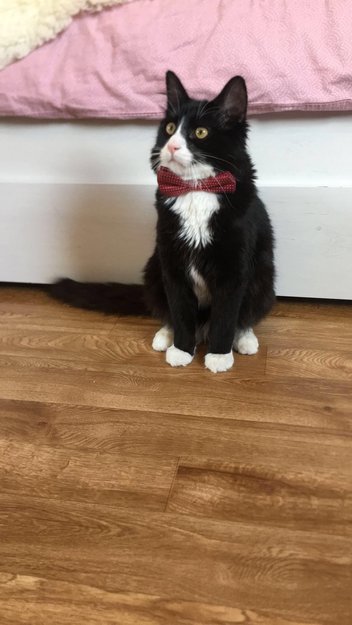 Svart katt med hvite poter, snute og bryst. En relativt stor langhåret katt på rundt 6 kilo. Han er veldig sosial, og kommer bort hvis du later som du har en godbit.