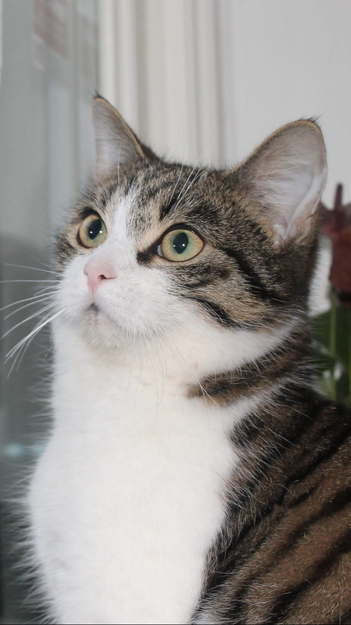 Leo er brun, med svarte striper og hvit under halsen, magen og nedover kroppen. Han har en søt liten rosa nese og nydelige gule øyne. Han er veldig redd mennesker ute og kommer kun overens med oss.