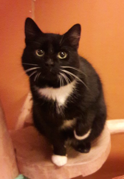 Meget kosete hokatt, ikkje chippa. Har 3 kvite poter, og ein svart med nokre kvite hår på tærne.