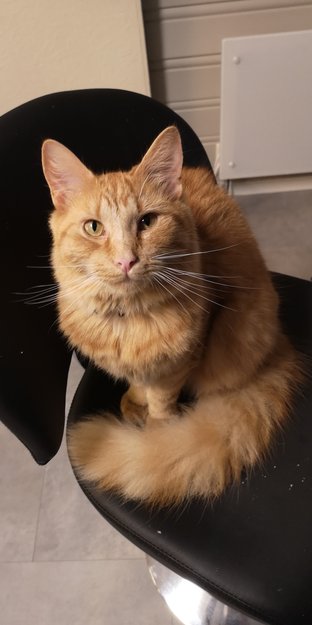 Han er kastrert, chippet og ID merket. Han har et svart halsbånd og en usedvanlig lang og bustete hale. Når han mjauer lager han som regel en slags kurrelyd før selve mjauet. Han er kosete og snill.