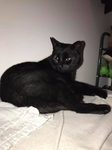 Katten har to hvite flekker, en på bryste og en på nedre mage region.