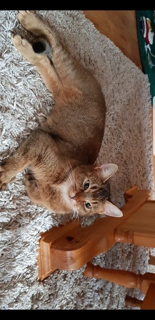 3-delt farge på håra, brunaktig med svart ytterst ettersom ho er litt Abyssiner. Litt kvit under haka.