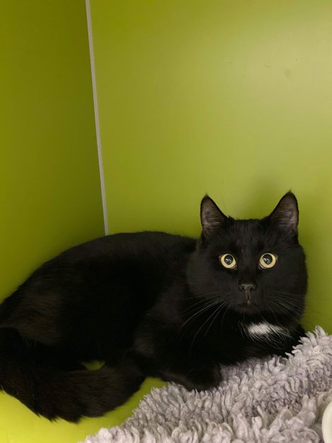Tillitsfull, godt hold, 4-5 år, ukastrert sort hann med en hvit flekk på brystet.