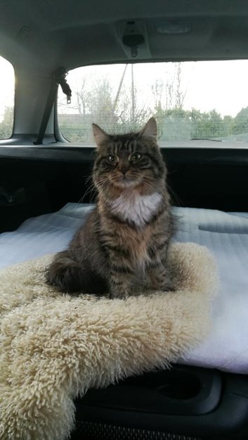Litt ekstra lange hår på deler av halen. Er nok en solid blandingskatt. Hvitt merke på brystet. En del sort/ veldig mørk pels på ryggen/halen. Helt nydelig katt