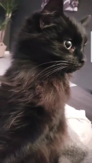 Veldig langhåra på halen, sort i utgangspunktet, men har litt brunskjær i enkelte lys.