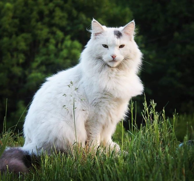 Katten er hvit med grå hale og en grå flekk på hodet, katten kan være sjenert på fremmede men om fremmede gir katten mat så kan han bli tillitsfull og dermed ikke komme hjem igjen. Han kan også hjemme seg i garasjer der det er ly og varme.