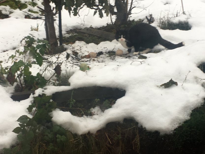 Denne kattten er sulten og spiser maten til fuglene. Har ikke sett den her før. Vi har selv katt og syntes det er stusselig med denne vandreren