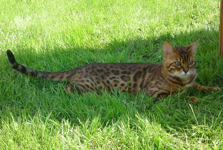 Stor ukastrert hannkatt med spesielt mønster. Rødbrun bakgrunnsfarge med rosetter i sort og brunt
